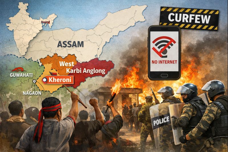 Violent clashes erupted in Assam’s Karbi Anglong district due to tensions over alleged illegal non-tribal settlements. So far, two people have died, dozens are injured, and the state government has imposed curfew-like restrictions and suspended mobile internet services in two districts.